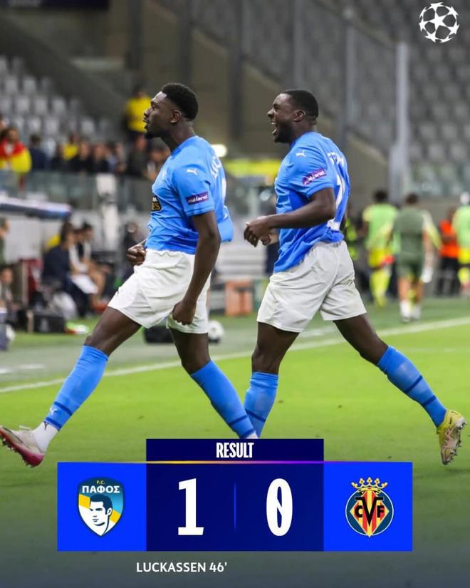 此役最大的功臣則是盧卡森,他打入了全場唯一進(jìn)球。歷史時刻發(fā)生在比賽第47分鐘,帕福斯贏得角球機(jī)會。塞馬踢出一記弧度極佳的傳中進(jìn)入比利亞雷亞爾禁區(qū),埋伏在后點的盧卡森,高高躍起力壓防守隊員頭槌破門,帕福斯1-0比利亞雷亞爾,主場6314名現(xiàn)場觀眾瞬間沸騰了,最終憑借著這一粒歷詩般的進(jìn)球,拿下了隊史首場歐冠勝利。