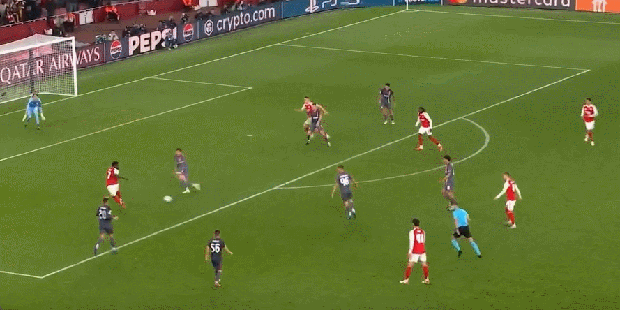 薩卡此役最高光的時刻是第82分鐘和第92分鐘。第82分鐘,薩卡沿右路突入禁區(qū)橫傳門前,但厄德高接應橫傳近距離射門被封堵。至于第92分鐘,薩卡則突入禁區(qū)接應直塞抽射,皮球從對方門將佐拉基斯胯下穿越入網(wǎng)。