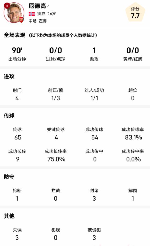 厄德高本場(chǎng)比賽貢獻(xiàn)4次射門,1次成功過人;65次傳球。4次關(guān)鍵傳球,1次助攻,傳球成功率83.1%。防守方面還貢獻(xiàn)了1次搶斷3次封堵和1次解圍。